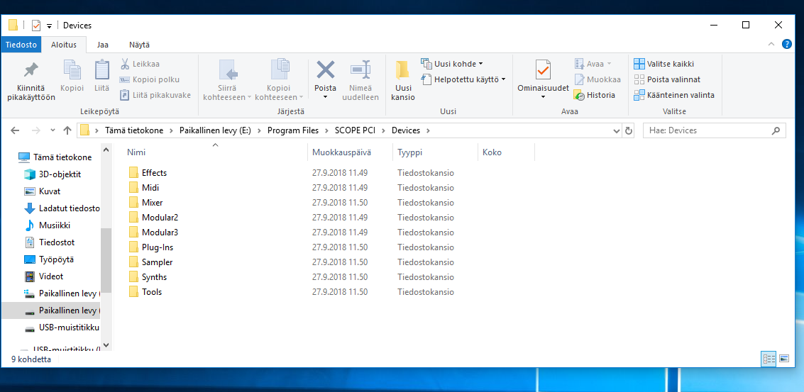 Yes : reinstall scope and in the Scope folder\Devices you should see effect, midi, mixer, modular, plug-ins, sampler, synth and tool forders. It's like your menus are pointing to a wrong place.